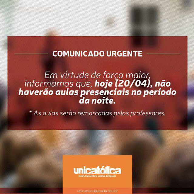 A Unicatólica acaba de suspender todas as aulas no periodo noturno devido ameaças de atentados terroristas em Quixadá!!! Navegação de Post ACONTECEU AGORA: Grande Fortaleza tem segundo dia de ataques a ônibus e delegacias Acusado de homicídio e outros delitos é morto a tiros em Campos Sales-Ce