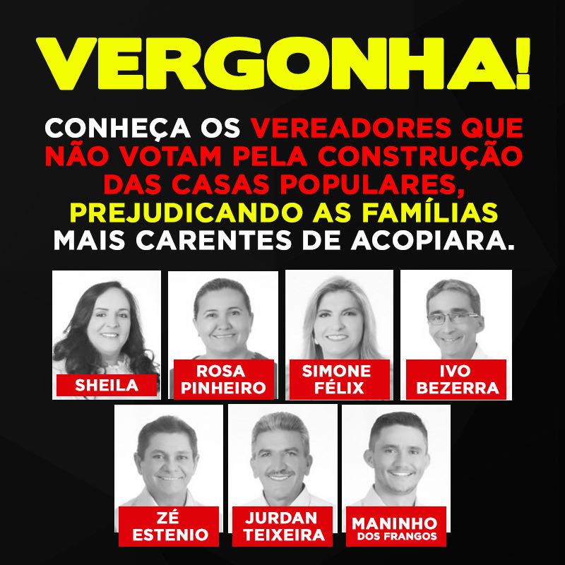 Uma verdadeira vergonha para o município de Acopiara! Na sessão desta quarta-feira (19) da Câmara Municipal, onde seria votado projeto de lei do Executivo que libera uma verba de um pouco mais de 36 mil reais para custeio de despesas com a documentação para os beneficiários das casas populares, conseguidas pelo Prefeito Antônio Almeida, através de um programa de habitação em parceria com a Caixa Econômica Federal e o Banco Paju, simplesmente os vereadores que fazem a bancada de oposição se abstiveram de votar em favor da população mais carente que sonha com uma casa própria.