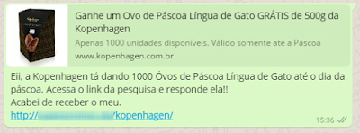 No caso do golpe do ovo de Páscoa, o golpe envolve a promessa de que as lojas da marca Kopenhagen estão distribuindo um Ovo Língua de Gato para quem participasse da promoção. Obviamente, não é verdade.