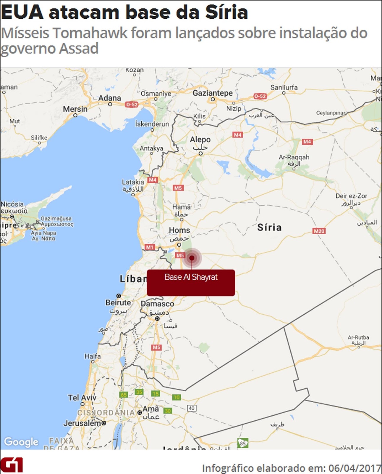 Os mísseis foram lançados na Al Shayrat Airfield, perto de Homs e teriam atingido aeronaves, pistas e bombas de combustível.
