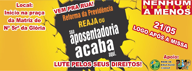A atual conjuntura nos convoca urgentemente para que deixemos o nosso comodismo de lado, e saímos do conforto de nossos lares, das paredes de nossas igrejas, comunidades e grupos, para enfrentarmos juntos a grande batalha pela permanência dos nossos direitos e pelo o restabelecimento da democracia e cidadania. É inadmissível, continuarmos calados e paralisados diante de tanto retrocesso e arbitrariedade cometida por políticos, corruptos que não tem legitimidade para fazer o que estão fazendo com o nosso país. É neste contexto sombrio que convocamos os cristãos e pessoas de boa vontade, e a sociedade em geral para se posicionarem e se mobilizarem no dia 21/05 contra os retrocessos que vem ocorrendo em nosso país, principalmente a Reforma da Previdência e a Reforma Trabalhista, medias cruéis que vão abalar drasticamente a vida dos Brasileiros, principalmente os de menor poder aquisitivo.