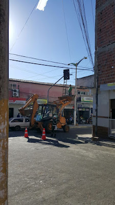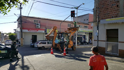 Neste exato momento, autoridades do departamento municipal de trânsito(DEMUTRAN), está realizando reparos no semáforo do centro da cidade.