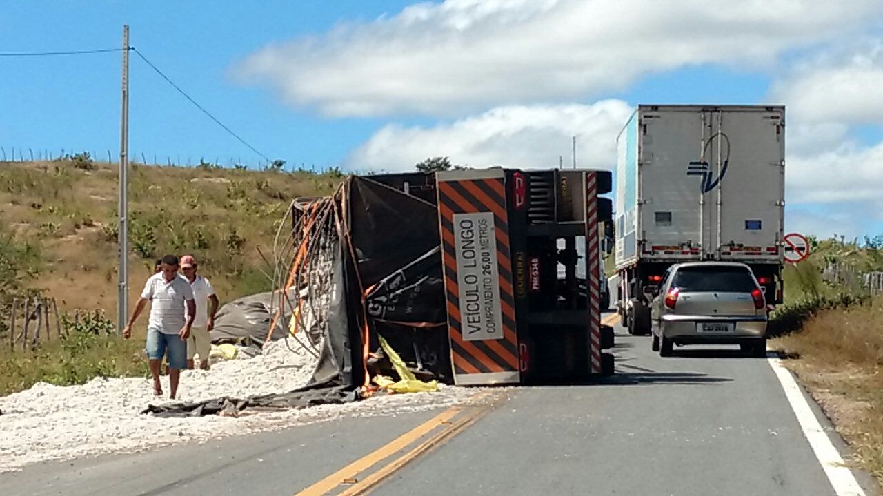 Carreta bi-trem, com placa de Senador Pompeu, carregada com caroço de algodão tombou agora a pouco na descida da serra BR-226, próximo ao distrito de Mineirolândia, Município de Pedra Branca/CE