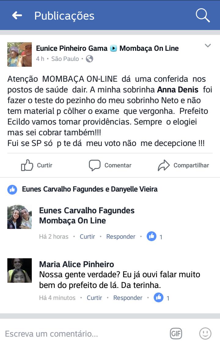 Dessa vez a reclamação veio da moradora de Mombaça, Anna Denis que teve um bebê a alguns dias e a senhora Eunice Pinheiro, conterrânea e eleitora do atual prefeito! Elas cobram material para um exame simples e exigido por LEI que é o teste do pezinho. A falta de material é tão verídica pois outras mães já vieram pedir ajuda e relatar fatos sobre a denúncia. Moradores precisam usar meios de comunicação por não obterem respostas concretas.