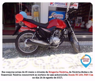 Nas compras acima de 25 reais o cliente da Drogaria Valéria concorrerá ao sorteio de uma motocicleta Honda CG 125i Fan 0 Km na próxima segunda-feira, dia 14 de agosto, na véspera do feriado municipal de Nossa Senhora da Glória, em transmissão ao vivo pela rádio Central FM 102,9 MHz (afiliada Liderança Sat).