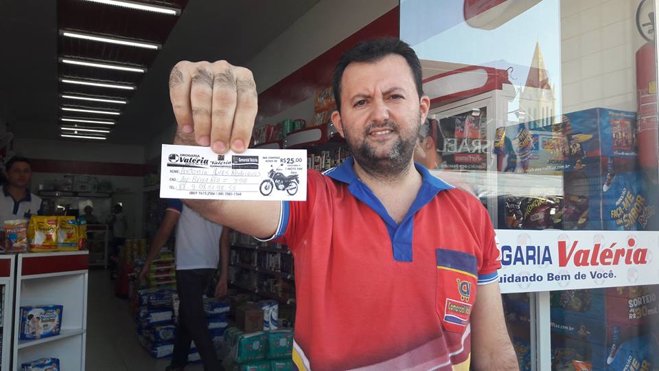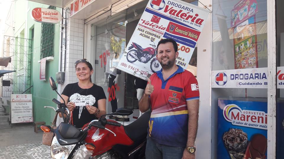 A Drogaria Valéria realizou na tarde de ontem, dia 14 de agosto, o sorteio de uma motocicleta Honda CG 125i Fan 0 Km, em transmissão ao vivo pela rádio Central FM 102,9 MHz (afiliada Liderança Sat).