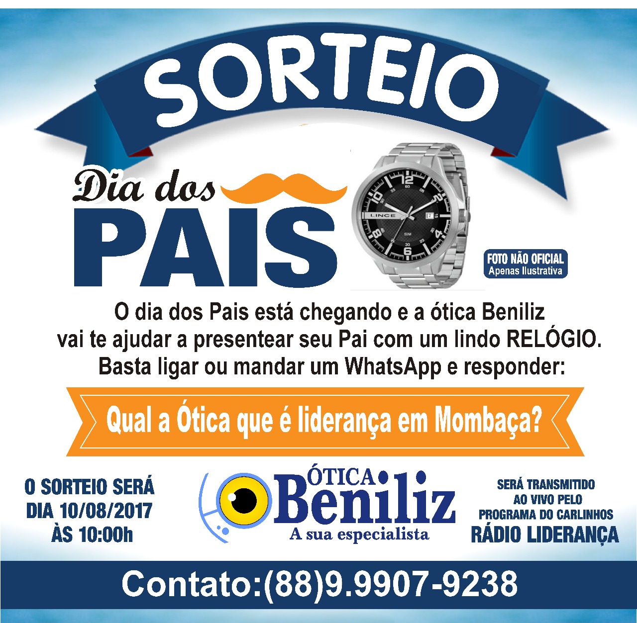 A Ótica Beniliz sempre pensando no conforto e satisfação dos seus clientes e amigos, irá sortear um lindo relógio para o DIA DOS PAIS.