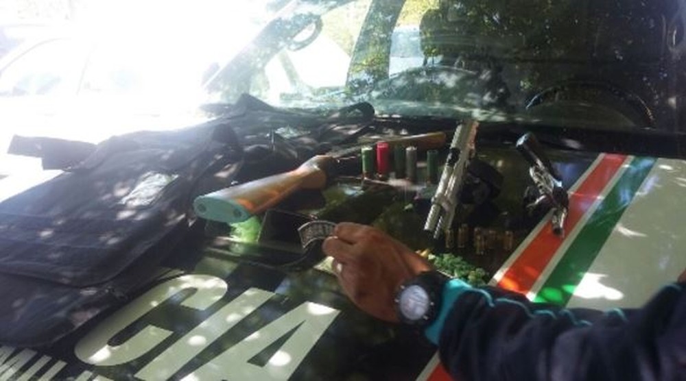 Com eles, a polícia encontrou um revólver calibre 38, uma pistola .40, uma espingarda calibre 12, munições para as três armas e um colete balístico. Um dos envolvidos também estava com 50 pedras de crack.