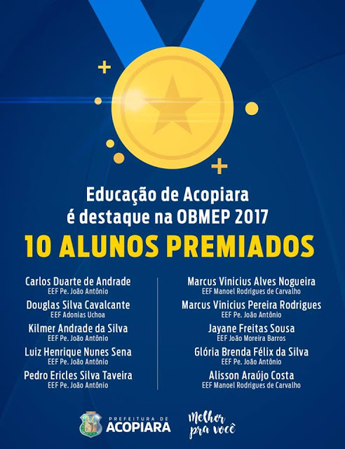 A Secretaria de Educação de Acopiara, através do secretário Robinho Almeida parabeniza aos alunos premiados, professores e gestores, aos que colaboraram para alcançar esse resultado e aos demais alunos que participaram da OBMEP 2017.