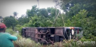 O ônibus da banda “Cavalo de Pau” tombou próximo ao povoado de Lagoa Redonda, no Maranhão. A banda estava a caminho da cidade de Passagem Franca, quando veículo derrapou e capotou.