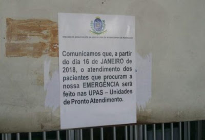 A medida dá-se devido à falta de recursos para manter os atendimentos clínicos realizados no setor. No comunicado, pregado na recepção da Emergência, a instituição pede que os pacientes dirijam-se para as Unidades de Pronto Atendimento (UPAs).