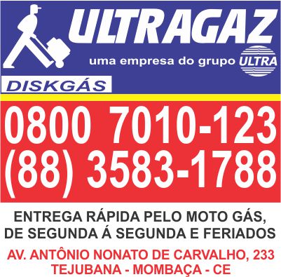 A ULTRAGAZ OFERECE UM SERVIÇO DE QUALIDADE E RAPIDEZ NA ENTREGA DO SEU GÁS DE COZINHA! BASTA LIGAR NOS TELEFONES: 0800 7010-123 (GRÁTIS) (88) 3583-1788 (FIXO) Navegação de Post FALTA DE ÁGUA? PROCURE QUEM TEM A SOLUÇÃO: CLAUDINEY PERFURAÇÕES! MOMBAÇA: FNDE DIVULGA PREVISÃO DE MAIS DE 26 MILHÕES PARA EDUCAÇÃO EM 2018