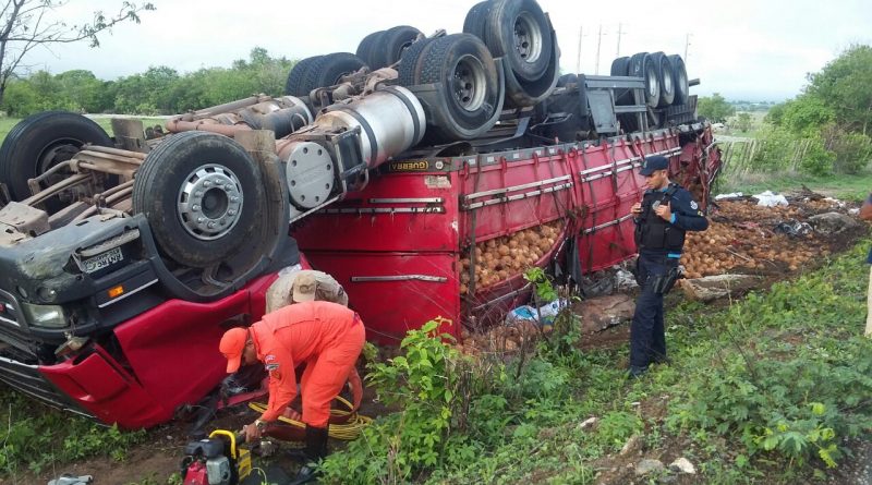 Na manhã deste domingo (18), por volta das 06h10min, foi registrado um capotamento no km 12, envolvendo uma carreta vermelha, SCANIA/G 400 A6X2, de placas NZS 0060, com inscrição de Monte Santo-BA, carregada de coco.