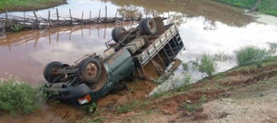 Um caminhão F 4000 que faz o transporte de passageiros na linha Tauá-Marruás, passando pelas localidades de Olho D água, São José, Palmeiras e outras regiões, caiu no açude da propriedade do Sr. José Teixeira, na localidade de Riacho do Mel, distrito de Marruás.
