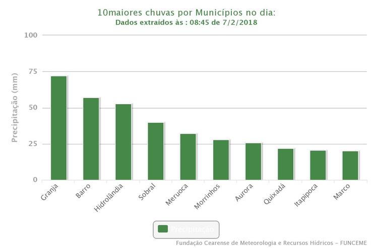 Choveu em 56 municípios no sétimo dia da estação chuvosa no Estado. As cidades que registraram os maiores índices de precipitação foram Granja, no Litoral Norte, com 72 milímetros, Barro, no Cariri, com 57,2 mm, e Hidrolândia, na Serra da Ibiapaba, com 53,0 mm.