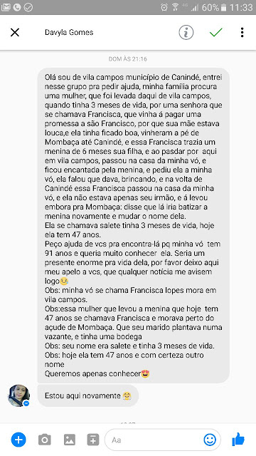 Em uma matéria publicada no site, ainda no ano de 2017, uma jovem pedia ajuda para procurar um ente de sua família, que estaria vivendo atualmente na cidade de Mombaça!