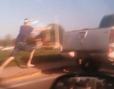 Pelas imagens, é possível ver dois homens planejando a ação dentro de outro veículo, que para ao lado da caminhonete, na via.