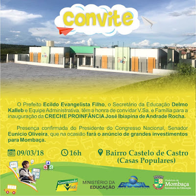 Segundo o convite e informações repassadas ao site, o Presidente do Senado, Eunício Oliveira estará presente hoje (09), na cidade de Mombaça, na inauguração da Creche PROINFÂNCIA José Ibiapina de Andrade Rocha, logo mais ás 16h, no Bairro Castelo de Castro (Casas Populares).