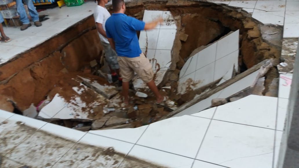 Segundo as primeiras informações é que existe um bueiro por baixo do mercantil e devido a grande quantidade de água, o mesmo não suportou e afundou nesta manhã.