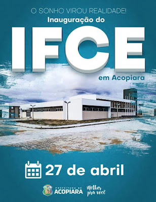 É com enorme satisfação que convido juntamente com o magnífico Reitor do IFCE, professor Virgílio Araripe, a cada um de vocês para a solenidade de inauguração do IFCE -Campus Acopiara que acontece no próximo dia 27 de abril.