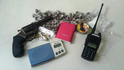Logo equipes da Polícia Militar seguiram para o local e abordaram o suspeito. O condutor da motocicleta, Francisco Fabrício de Sousa Almeida, 27 anos, alegou que a havia comprado em Ibaretama. Entretanto, em continuidade às investigações os policiais acompanharam os namorados até o novo endereço, no Residencial Rachel de Queiroz. No interior do imóvel encontraram um revólver municiado, um rádio de comunicação tipo HT, ainda maconha, crack e cocaína, um triturador de maconha e uma balança de precisão.