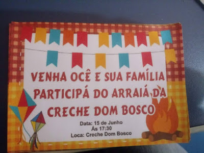 A direção e coordenação na Creche Dom Bosco, no Bairro Recreio, tem o imenso prazer de convidar à todos a participarem do nosso Arraiá, que será hoje, dia 15 de junho, ás 18hrs na Creche.