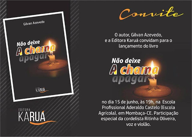 O grande poeta e escritor mombacense Gilvan Azevedo convida a toda a população, para participarem hoje, dia 15 de junho, de mais um sucesso lançado pela Editora Karuá, com o livro ” Não deixe a chama apagar” de autoria própria do nosso conterrâneo.