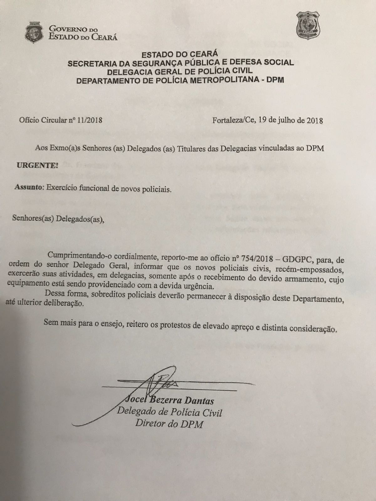 O ofício de Everado Lima, de número 754/2018-GDGPC, foi reproduzido pelos diretores dos departamentos de Polícia do Interior/DPI (Norte e Sul), de Polícia Metropolitana (DPM) e de Polícia Especializada (DPE). A ordem é para “os novos policiais civis, recém-empossados, exercerão suas atividades, em delegacias, somente após o recebimento do devido armamento”, ressalta o documento.