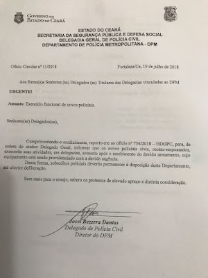 A ordem para que os novos policiais fiquem apenas “à disposição” de seus respectivos departamentos foi assinada pelo delegado-geral da Polícia Civil do Ceará, Everardo Lima, que seguiu determinação do secretário da Segurança, delegado André Costa, e este, do governador Camilo Santana.