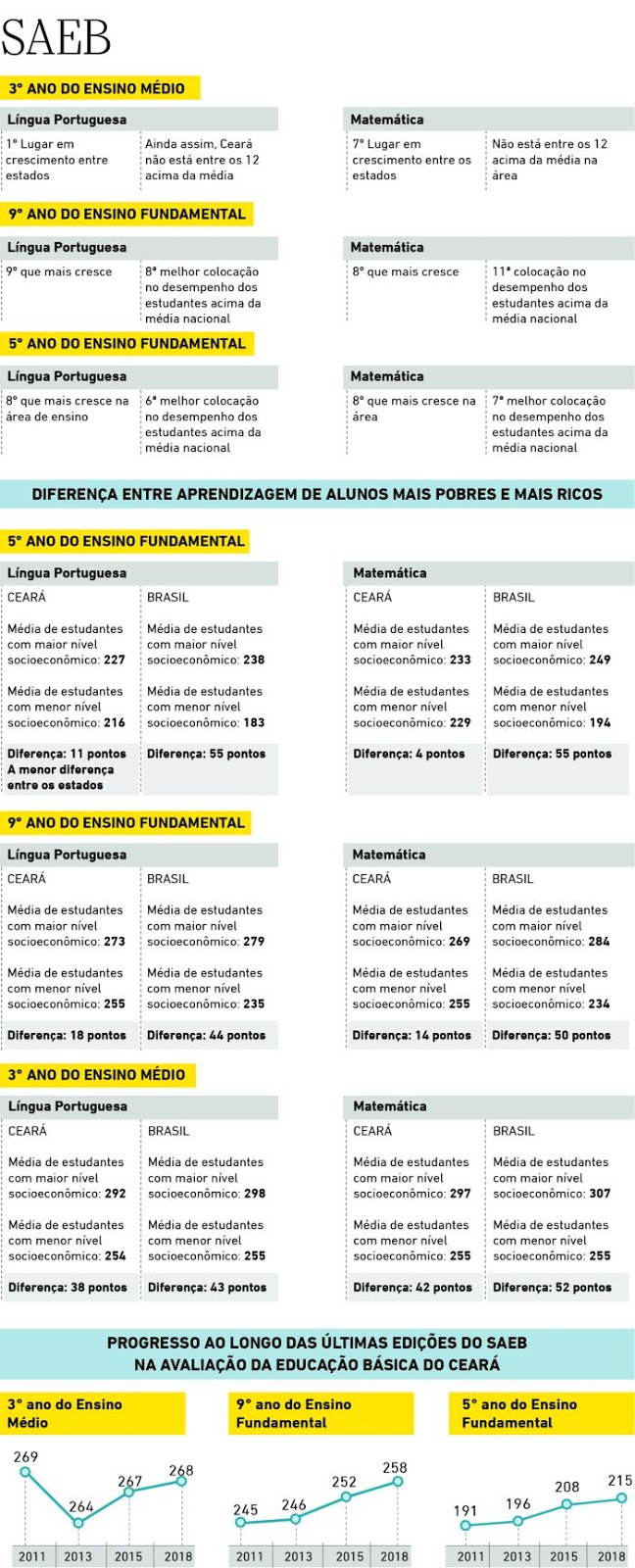 Apesar de números que ainda não acompanham a média de aprendizagem do ensino médio no Brasil, o Ceará foi o estado que mais cresceu na avaliação de Língua Portuguesa nesta fase de ensino. Com pontuação de 265,9, a alta em relação a 2015 foi de 9,3 pontos, seguido de Sergipe (8,3) e Minas Gerais (6,8). Os índices são do Sistema de Avaliação da Educação Básica (Saeb) e foram apresentados pelo Ministério da Educação (MEC) na manhã de ontem. Conforme o resultado, a educação pública do Ceará avançou em todas as etapas do ensino básico avaliadas. O dado expõe, no entanto, deficiências no ensino médio cearense.