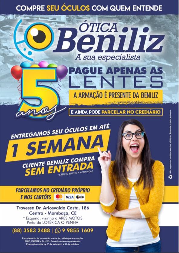 Amanhã, 28 de setembro, teremos atendimento na Ótica Beniliz!!! Que neste mês completa seus 5 anos em Mombaça, e pensando no melhor para os seus cliente vem trazendo grandes PROMOÇÕES!