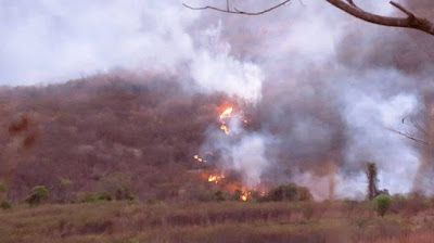 Moradores do distrito de Dom Maurício, localizado no cume da Serra do Estevão, informaram que uma queimada, iniciada no terreiro de um agricultor, provocou o incêndio de grandes proporções naquela região montanhosa com extensão de 24 km de por 10 km de largura, localizada a pouco mais de 20 quilômetros do Centro de Quixadá.