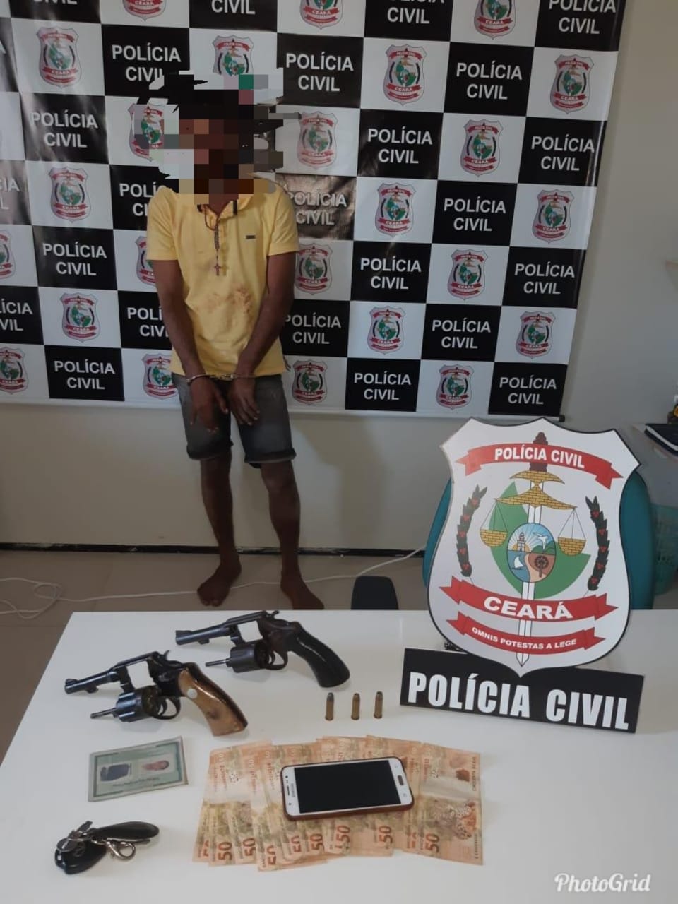 Dando continuidade as ações de combate a criminalidade na tarde do dia 29 de dezembro de 2018 policiais civis da Delegacia Regional de Senador Pompeu acompanhados de Policias Militares efetivaram a prisão em flagrante do senhor A. J. C. de O. L., o qual estava portando dois revólveres calibre 38.