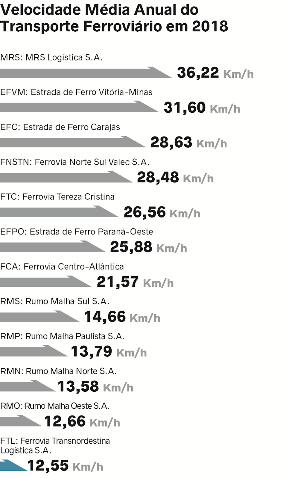 Segundo o documento, a velocidade média de percurso é de 12,55 quilômetros por hora (km/h), cerca de três vezes menos que a MRS Logística, que opera entre em Minas Gerais, Rio de Janeiro e São Paulo, cuja velocidade média ultrapassa os 36 km/h.