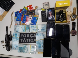 A polícia apreendeu dois veículos com placas de São Paulo, além de R$ 50 mil, cinco celulares, relógios, joias, um revólver calibre 38 e quatro munições. A Polícia Civil investigará possíveis participações da quadrilha em outros delitos.