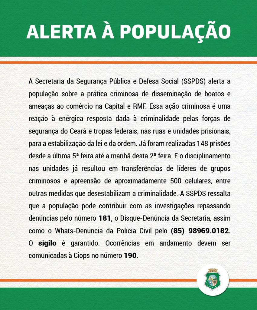 A Secretaria da Segurança Pública (SSPDS) emitiu nota alertando a população. sobre a prática criminosa e disseminação de boatos e ameaças ao comércio em Fortaleza e na Região Metropolitana. “Essa ação criminosa é uma reação à enérgica resposta dada à criminalidade pelas forças de segurança do Ceará e tropas federais nas ruas e unidades prisionais, para a estabilização da lei e da ordem”, traz a nota.