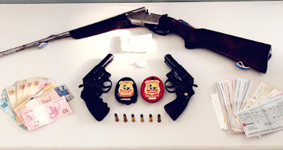Em decorrência das diligências realizadas, foram autuados em flagrante delito as pessoas de EUGENIO PEREIRA DA SILVA, vulgo BASTIAO, PAULO ROGERIO BENEDITO e GABRIEL INACIO DE SOUSA, vulgo BIEL ou NEGUINHO, tendo sido apreendidos 02 revólveres calibre .38, uma espingarda calibre .36, uma espingarda de fabricação artesanal do tipo socadeira, 06 munições intactas .38, 08 munições intactas e uma deflagrada .36, 60g de cocaína em processo de preparo para venda e 04 trouxinhas de cocaína, R$ 2.376,00 (dois mil, trezentos e setenta e seis reais) em espécie, e grande quantia em cheques.
