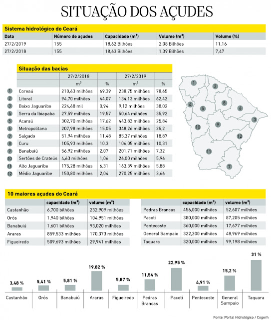Maior reservatório cearense, o Castanhão, localizado na bacia do Médio Jaguaribe, está com apenas 3,48%. Em 27 de fevereiro de 2018, essa marca era de 2,22%. O melhor nível do açude no ano passado foi observado entre 8 e 11 de maio (último mês da quadra chuvosa), ao atingir 8,7% da capacidade. Já o volume recorde é de 14 de maio de 2009, com 96,79%.