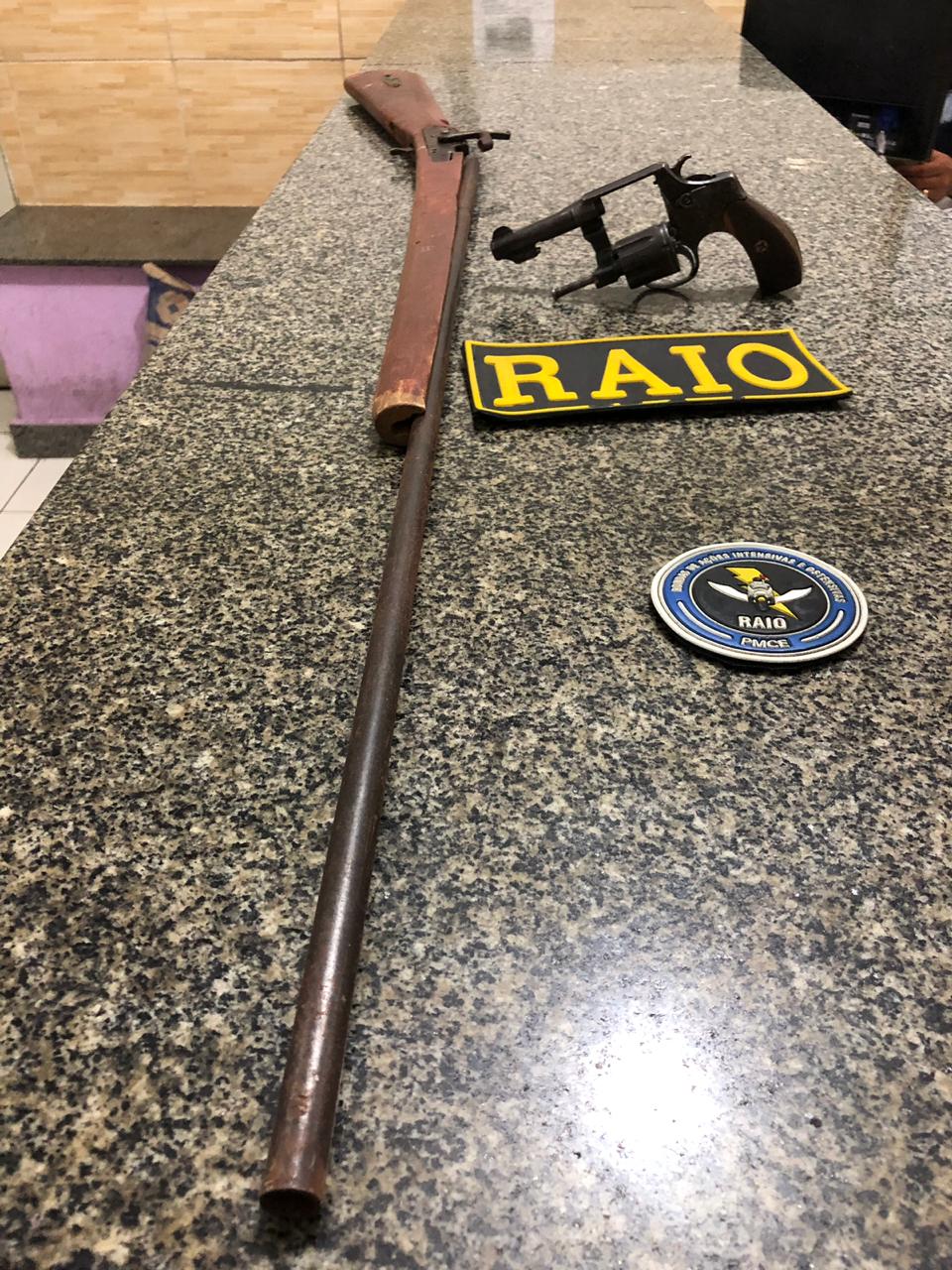No dia 14/03/2019 por volta das por das 17hs, a equipe RAIO 03 em patrulhamento pela região de lagoa nova/ distrito de Senador Pompeu, avistou dois elementos em atitude suspeita e de pronto realizaram a abordagem, durante a busca pessoal foi encontrado com W. S., 22 anos natural de Pedra Branca-CE, 01 Revólver calibre 32 desmuniciado, marca rosse oxidável com capacidade para 06 tiros e em seguida a equipe realizou uma busca em sua residência, com autorização do mesmo, onde foi encontrado uma espingarda tipo soca soca. O acusado e o material apreendido foram conduzidos para Delegacia Regional de Tauá para realização dos procedimentos cabíveis.