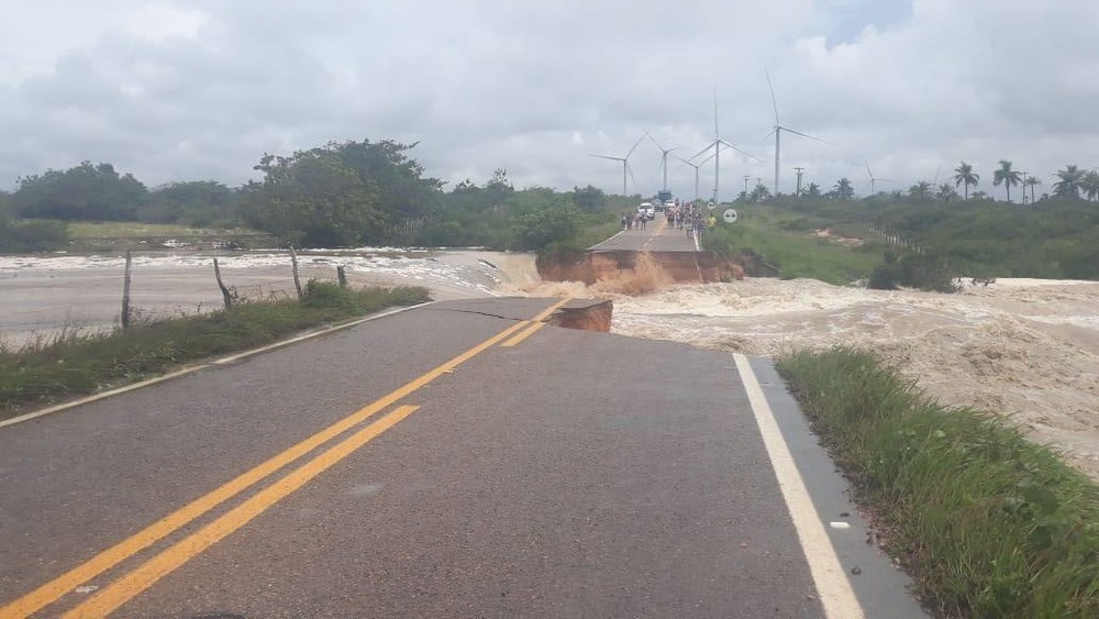 Uma passagem molhada foi destruída pela força da correnteza de um braço de rio no trecho da Rodovia CE-176 que dá acesso às praias de Icaraí de Amontada e Moitas, no litoral oeste do Ceará, no início da tarde deste sábado (23).