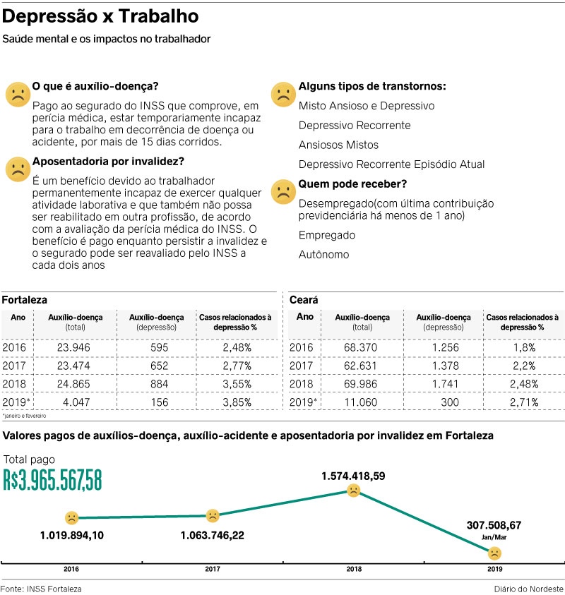 Para se ter ideia, no Ceará, somente em 2018, o Instituto Nacional do Seguro Social (INSS) concedeu quatro auxílio-doença por dia, para pessoas que não tinham condições de continuar trabalhando devido à depressão. Um total de 1.741 auxílios no ano, que evidencia um aumento de 38,6% se comparado aos índices registrados em 2017.