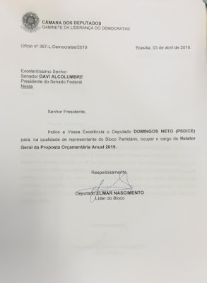 A confirmação do nome do deputado Domingos Neto foi oficializada pelo líder do bloco, deputado Elmar Nascimento. O ofício foi endereçado ao presidente do Senado, Davi Alcolumbre. Navegação de Post Relação com Israel ‘veio para ficar’, diz Bolsonaro a empresários Bolsonaro retoma conversas com partidos nesta terça-feira