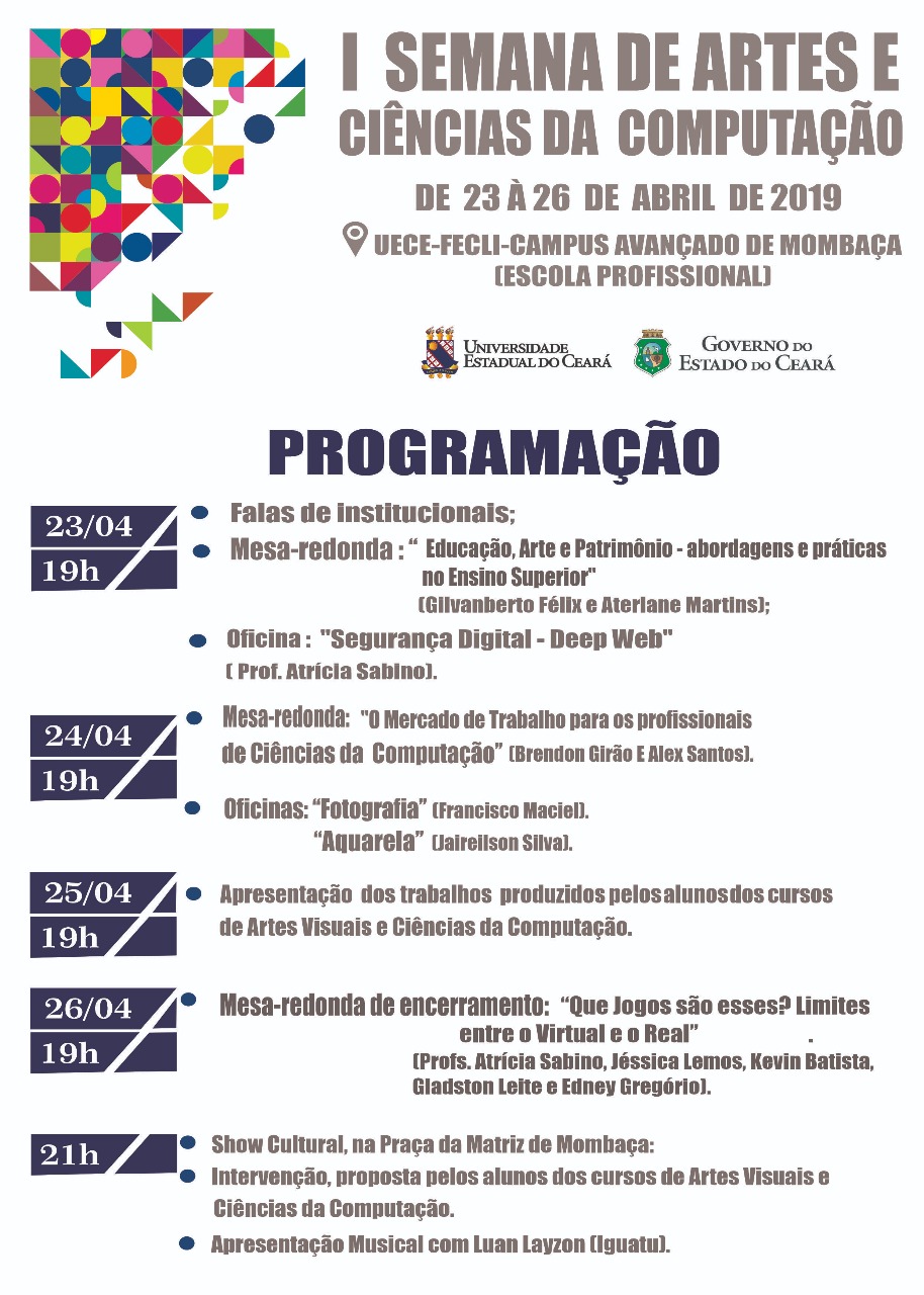 A Universidade Estadual do Ceará, por meio do Campus Avançado da FECLI em Mombaça, realiza a I SEMANA DE ARTES E CIÊNCIAS DA COMPUTAÇÃO, no período de 23 a 26 de abril, onde acontecerão mesas-redondas, oficinas e apresentações de trabalhos propostos pelos alunos dos dois cursos. Toda a programação terá início às 19h. O Campus está sediado na Escola Profissional (antiga escola agrícola). O evento é aberto ao público e a entrada é livre. O encerramento será na sexta feira, com atividades culturais e show musical com o cantor Luan Layson, de Iguatú, na Praça da Matriz, a partir das 21h. Mais informações na página do Facebook UECE Mombaça e no Instagram da UECE/FECLI. Venha participar conosco!