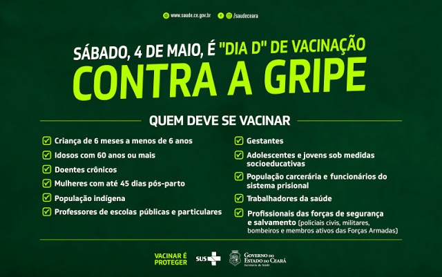 Este sábado, 4 de maio, é o dia D de vacinação contra a gripe. Todos os postos de saúde dos 184 municípios cearenses estarão abertos para vacinar os grupos prioritários. Serão 13.830 profissionais da saúde atendendo em 2.835 postos de vacinação. Um deles será o Centro de Saúde Meireles, unidade do Governo do Ceará, em Fortaleza, que funcionará das 8 às 17 horas.