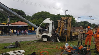 Um caminhão-guincho bateu em um poste que sustentava uma placa de sinalização deixando um ajudante morto e outro ferido, na manhã desta quarta-feira (8), no km 10 da rodovia CE-040, no sentido Fortaleza-Eusébio, a poucos metros do Centro das Tapioqueiras. O filho da vítima passava pelo local na hora do ocorrido e reconheceu o corpo do pai.