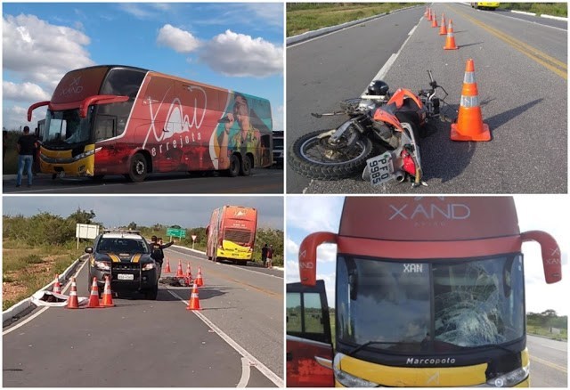 Um acidente entre uma moto e um ônibus da banda Aviões do Forró deixou uma pessoa morta na tarde desse domingo, 23. Segundo a Polícia Rodoviária Federal (PRF), um homem de 78 anos estava pilotando a motocicleta e provocou o acidente quando bateu na lateral do ônibus, não obedecendo a preferência da via. O piloto da moto morreu.