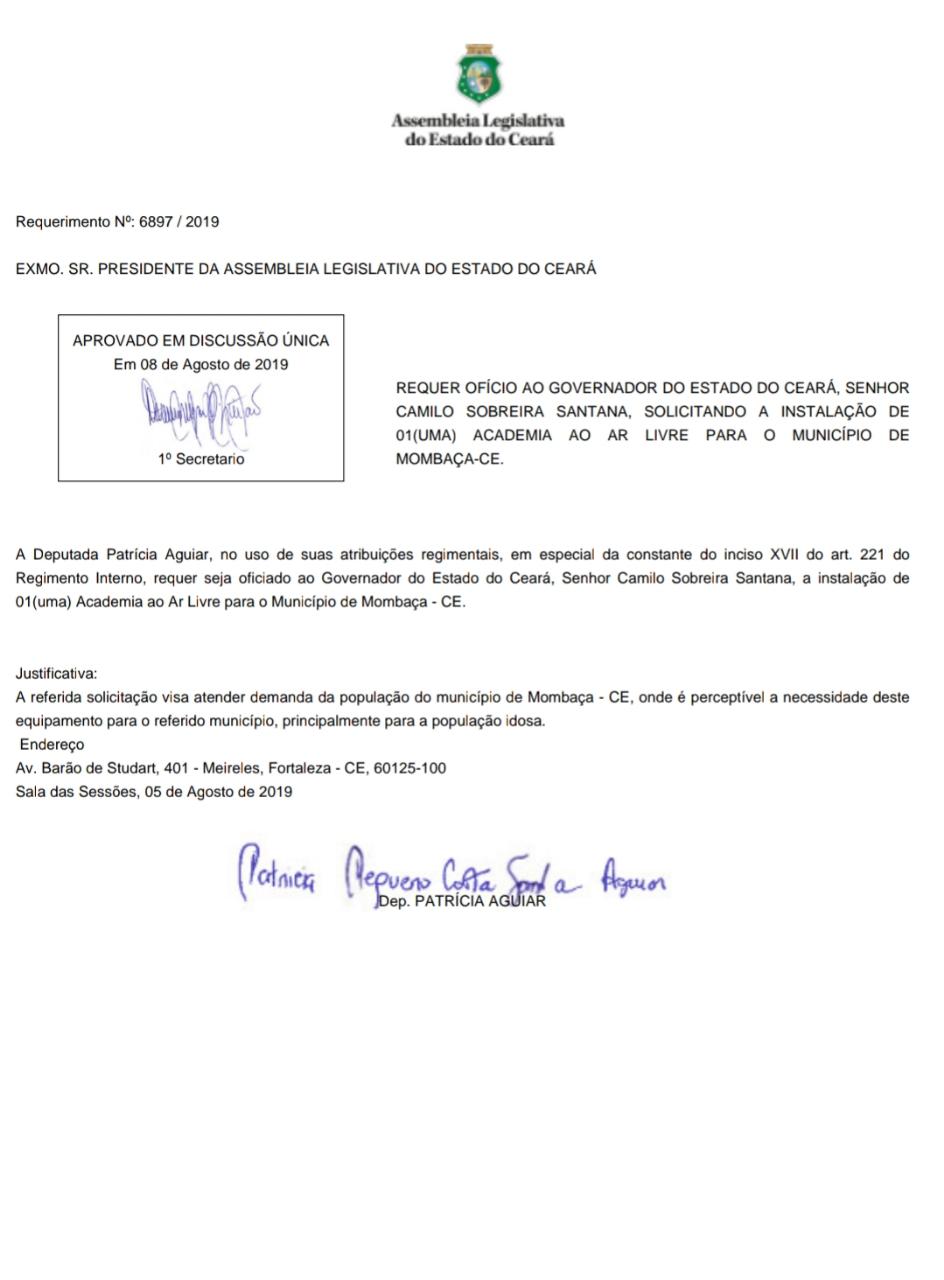 A deputada estadual Patrícia Aguiar, fez um requerimento solicitando uma academia ao ar livre em nossa cidade, visando melhorias na saúde e colaborando com a integridade dos cidadãos mombacenses.