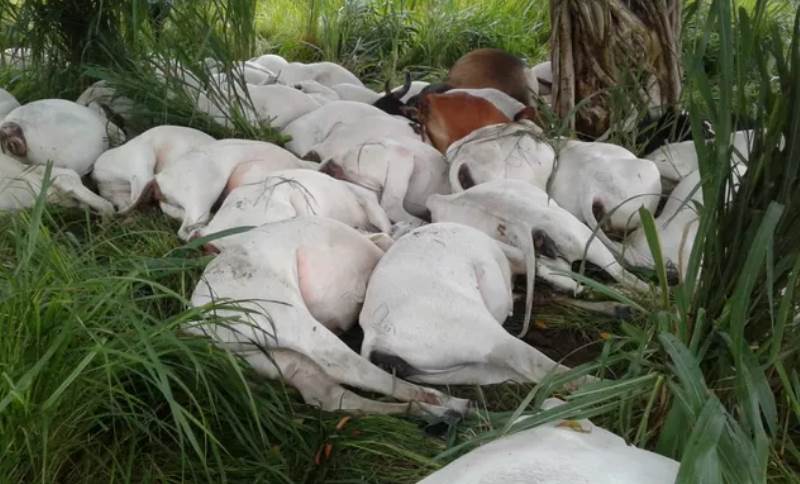 Um raio matou 44 novilhas em uma fazenda de Poconé, a 103 km de Cuiabá, na semana passada. Os animais estavam aglomerados embaixo de uma figueira quando foram atingidos.