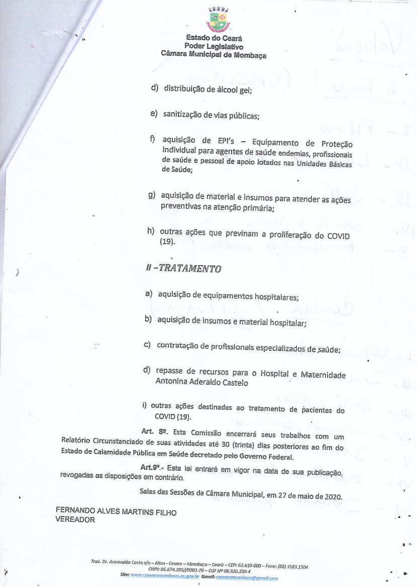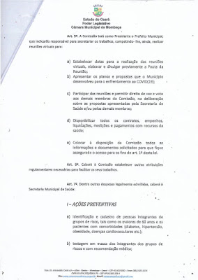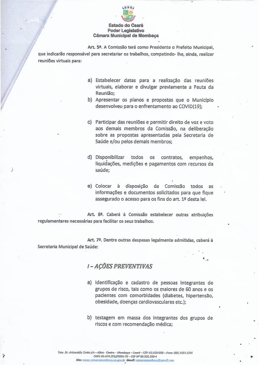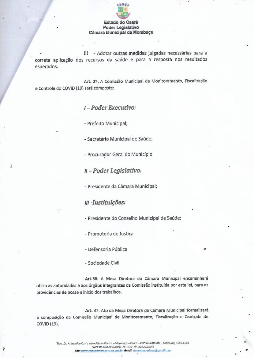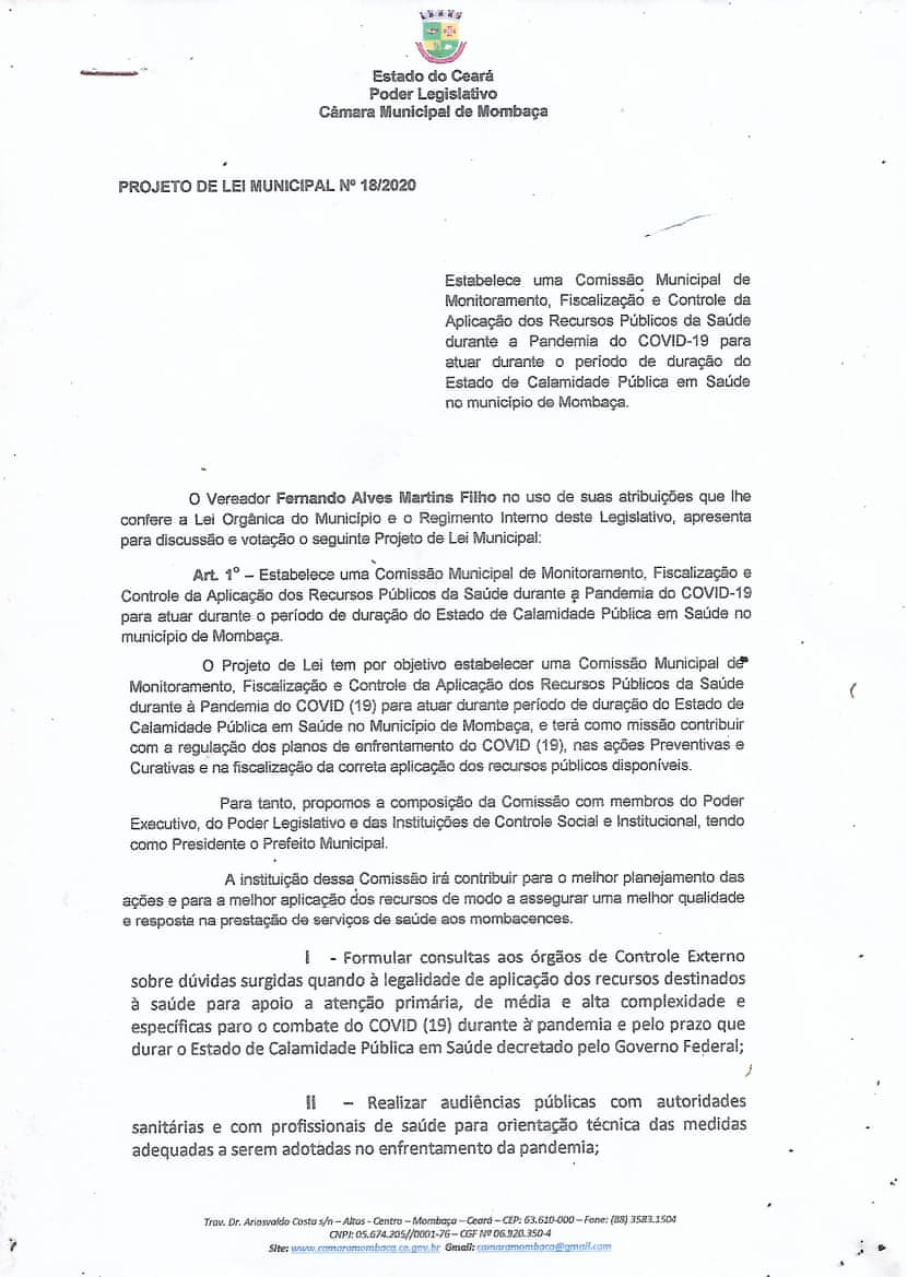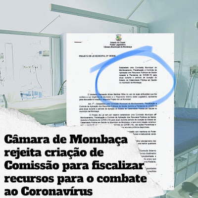 Ao contrário do que está previsto na Constituição Federal e nas boas práticas administrativas, a Câmara Municipal de Mombaça rejeitou, durante a sessão da última quinta-feira (28), a criação da Comissão Municipal de Monitoramento, Fiscalização e Controle da aplicação dos recursos públicos repassados ao Fundo Municipal de Saúde para apoio às políticas da Atenção Primária, da Média e Alta Complexidade e para o combate ao COVID (19).