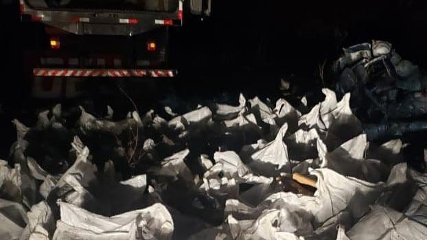 Durante a abordagem, os suspeitos trocaram tiros com a Polícia, fugiram pelo matagal e não foram localizados até o momento. A droga estava armazenada em dezenas de sacos, no baú do caminhão.